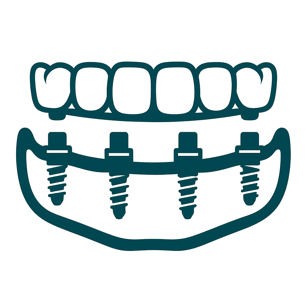 After assessment and imaging, several implant posts are placed into the jaw. Once healed and integrated with bone, a fixed prosthesis (bridge-type structure) is securely attached—often restoring full arch teeth in a single prosthetic piece.
